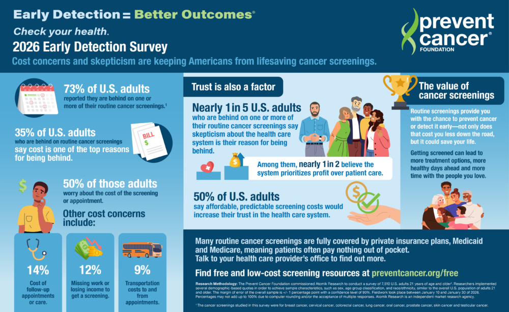 “While we’re encouraged to see some rebound in routine medical visits, the reality is that progress has stalled,” said Jody Hoyos, CEO of the Prevent Cancer Foundation®. “Cost concerns continue to be a major barrier—not because screenings are always expensive, but because people don’t have clear information about what’s covered. When fear and confusion stop people from getting screened, we lose the chance to prevent cancer or catch it early, when it’s easier to treat. We lose the chance to save lives.”